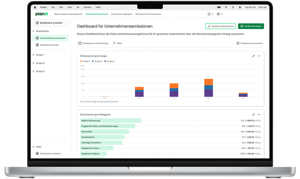 Die Nachhaltigkeitsplattform unseres Partners Plan A automatisiert die CO2-Bilanzierung, die wissenschaftlich fundierte Zielsetzung von Klimazielen, die Dekarbonisierung und die ESG-konforme Berichterstattung. Die intuitive und modular aufgebaute Software erlaubt eine schnelle Datenerfassung, Analyse und automatisierte Berichterstellung. Dabei können Sie ganz einfach mehrere Unternehmenstandorte oder Unternehmensbereiche sowie Ihre Wertschöpfungskette abbilden. Die Bedienung der Software erfordert kein tiefergehendes Wissen im Bereich CO2-Bilanzierung und ESG-Berichterstattung.