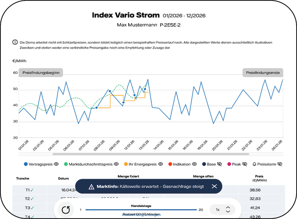Die Demo ermöglicht es Ihnen, verschiedene Einkaufsstrategien ganz ohne Risiko auszuprobieren. Sie zeigt auf einen Blick, wie sich Marktpreise und Zeitpunkte auf die Kosten auswirken, macht komplexe Zusammenhänge sofort verständlich und unterstützt so fundierte Entscheidungen für den optimalen Energieeinkauf.