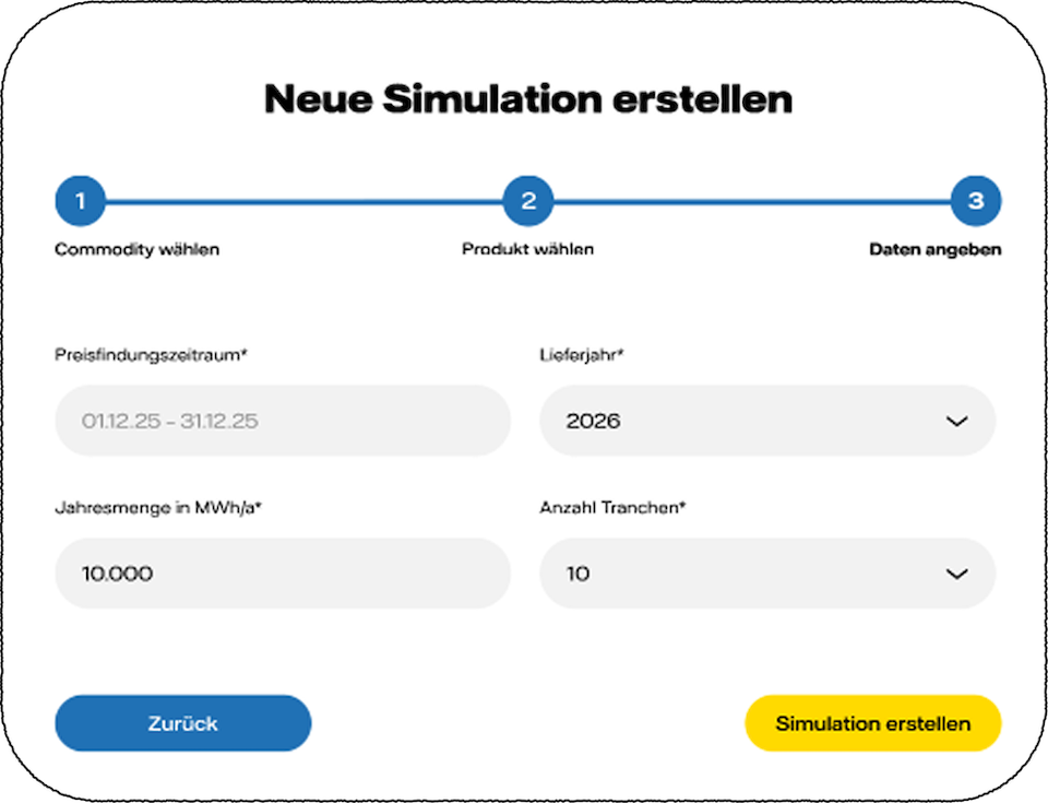 - Dynamische Einkaufssimulation: Spielen Sie verschiedene Zeitpunkte für die Bestellung Ihrer Tranchen durch und lesen Sie so den Einfluss der Energiepreisentwicklung auf Ihre Tranchenorder ab