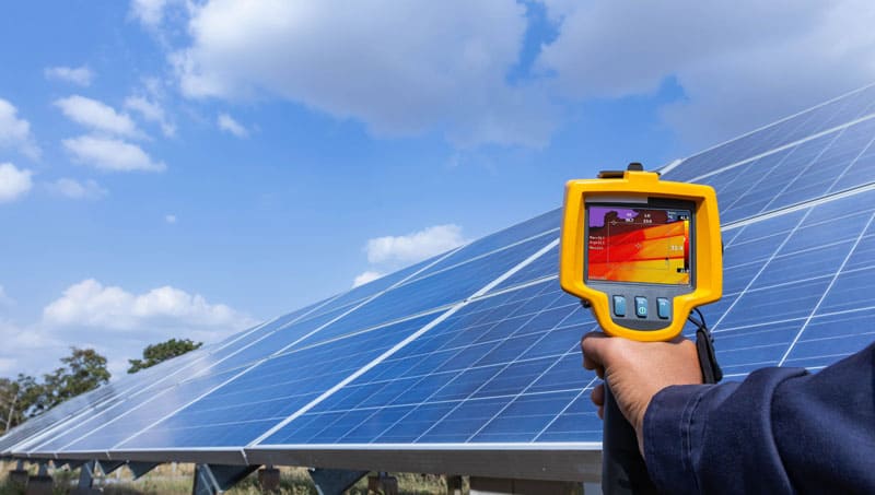 Bei Photovoltaik-Anlagen wird die Thermografie eingesetzt, um mögliche Defekte oder Hotspots zu identifizieren. Hierzu werden entweder Aufnahmen vom Boden oder auch Aufnahmen unter Einsatz von Drohnen gemacht. So kann man auch schwer zugängliche Anlagen oder große Freiflächenanlagen relativ einfach thermografieren. Durch regelmäßige thermografische Inspektionen können potenzielle Probleme wie verschmutzte oder beschädigte Solarzellen, fehlerhafte Verkabelung oder unzureichende Kühlung erkannt werden. So lassen sich Ausfälle oder Leistungseinbußen verhindern.