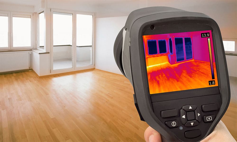 Thermografie nutzt Infrarotstrahlung, um Temperaturunterschiede in Oberflächen sichtbar zu machen. Im Bereich der Immobilien können diese z. B. den Außenwänden eines Hauses im Vergleich zu den Fenstern auftreten.