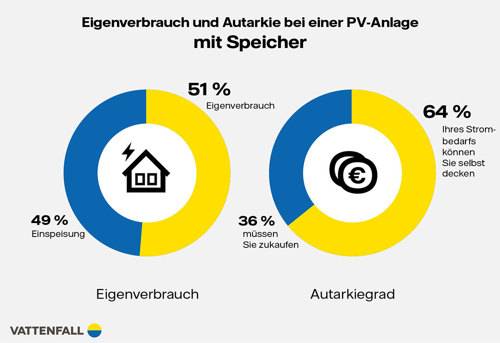 *Das Bespiel enthält zukunftsgerichtete Aussagen. Die tatsächlichen Werte können erheblich vom Beispiel abweichen, da diese von nicht vorhersehbaren künftigen Ereignissen, Ihrem (Stromverbrauchs-)Verhalten, Standort und Wetterbedingungen sowie der Einspeisevergütung und von bestimmten Vorgaben (Erneuerbare-Energien-Gesetz) abhängt, auf die Vattenfall keinen Einfluss hat. Vattenfall übernimmt keine Haftung für die hier dargestellten Informationen.