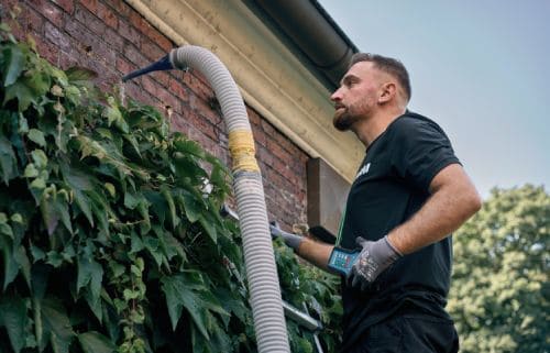 Eine relativ unkomplizierte und kostengünstigere Variante, besonders für ältere Gebäude, ist die Einblasdämmung. Hierbei wird Dämmmaterial über kleine Löcher in Hohlräume in der Fassade eingeblasen. Durch sehr viel Druck verdichtet sich das Material und dämmt das Haus.